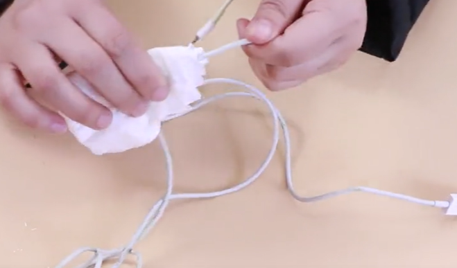 直接将白酒倒在纸巾上面,可以多倒一些,然后对着数据线给他摩擦一下,轻轻一摩擦,大家可以看到数据线变得非常干净,而且污垢全部给它擦下来了,因为酒精有很好的消毒、杀菌清洁的作用,可以快速的将数据线清洁的非常干净。