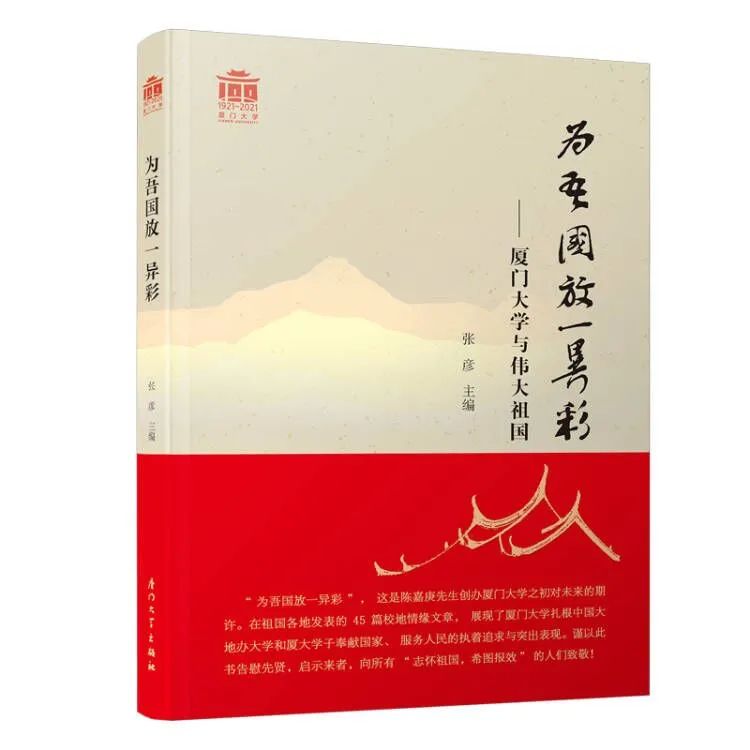 2021年,时任厦门大学党委书记的中共福建省委常委、宣传部部长张彦主编《为吾国放一异彩——厦门大学与伟大祖国》一书,并在厦大社出版。书中阐述了近百年来厦大紧密围绕国家和地方战略需求,主动为国家和地方服务,在地方人才培养、科学研究和社会服务等方面做出的努力和贡献,以及一代又一代厦大人扎根五湖四海、放歌天南地北、书写家国情怀的感人故事,为厦大百年校史留下了浓墨重彩的一笔。