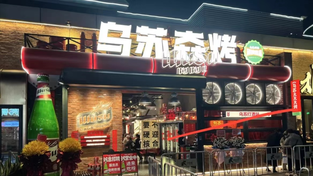 “?”音同“太”,意思为“很大”。而乌苏烧烤店便以“大”为特色,一米长的羊后腿肉串、四五斤重的大烤羊排、三四斤重的烤羊腿,以及用来装烤串的桶,无时无刻都在突出“大”的特点。除了“大”之外,乌苏?烤里面还有很多新疆西北为特色的小吃和饮品,包括主食类的烤馕、汤类的肚包肉汤,还有特制的杏皮水、甜胚子奶茶等。此外,乌苏烧烤店内上线了很多其他门店没有的特色口味啤酒,比如仙人掌味道的啤酒、乌苏黑啤、乌苏白啤等。大众点评APP显示,该门店目前已成为静安区烧烤烤串热门榜第3名,人均消费定位在143元,主打中高端烧烤的产品路线。“特色十足”“夜宵圣地”“服务及时”不少消费者在品尝后表示,肉很大块,啤酒也好喝,非常过瘾。乌苏方面称,“我们的门店越多,让消费者体验我们酒的场景就会越多。所以,乌苏开烧烤店是以消费者的体验为主要目的。”据悉,目前乌苏?烤只有上海这一家门店,公司以后还有开连锁的计划。公开资料显示,乌苏啤酒源自新疆,创立于1986年,目前是丹麦嘉士伯集团成员重庆啤酒的下属品牌。近年来凭借着出色的市场占有率和增长率迅速走出新疆成为全国品牌,更是凭借着高酒精度和麦芽浓度,上劲迅速、醒酒快而走红,被冠以“夺命大乌苏”之名。此前,重庆啤酒一直在推动旗下乌苏啤酒的全国化布局。2021年,重庆啤酒在业绩说明会上表示,为乌苏新增20个乌苏“大城市计划”,拓展更多城市市场。当年新增产能包括江苏盐城13万千升产能的新工厂,以及宜宾和大理的新罐线。根据重庆啤酒披露,2021年上半年乌苏啤酒在新疆以外的市场增长了将近89%,企业也把“将加速(乌苏)品牌在全国的知名度增长和全国拓展的步伐”作为经营计划。光大证券研报曾表示,红乌苏比其他主流啤酒的经销商利润和终端利润高出很多,因此经销商铺货积极性高。数据显示,从2019年到2021年,乌苏啤酒的全国销量迎来爆发式增长,2020年,乌苏啤酒全国销量增长27%达62万吨,其中疆内外销量各占一半。2021年,乌苏啤酒销量达到80万吨以上,同比增长34%。但从2022年上半年开始,乌苏品牌的增速出现了明显放缓。因此本次跨界餐饮也被认为是乌苏啤酒的自救之路。近两年,酒企加码的餐饮店已经不再是新鲜事了,除乌苏啤酒外,不少酒企都在探索线下体验店。