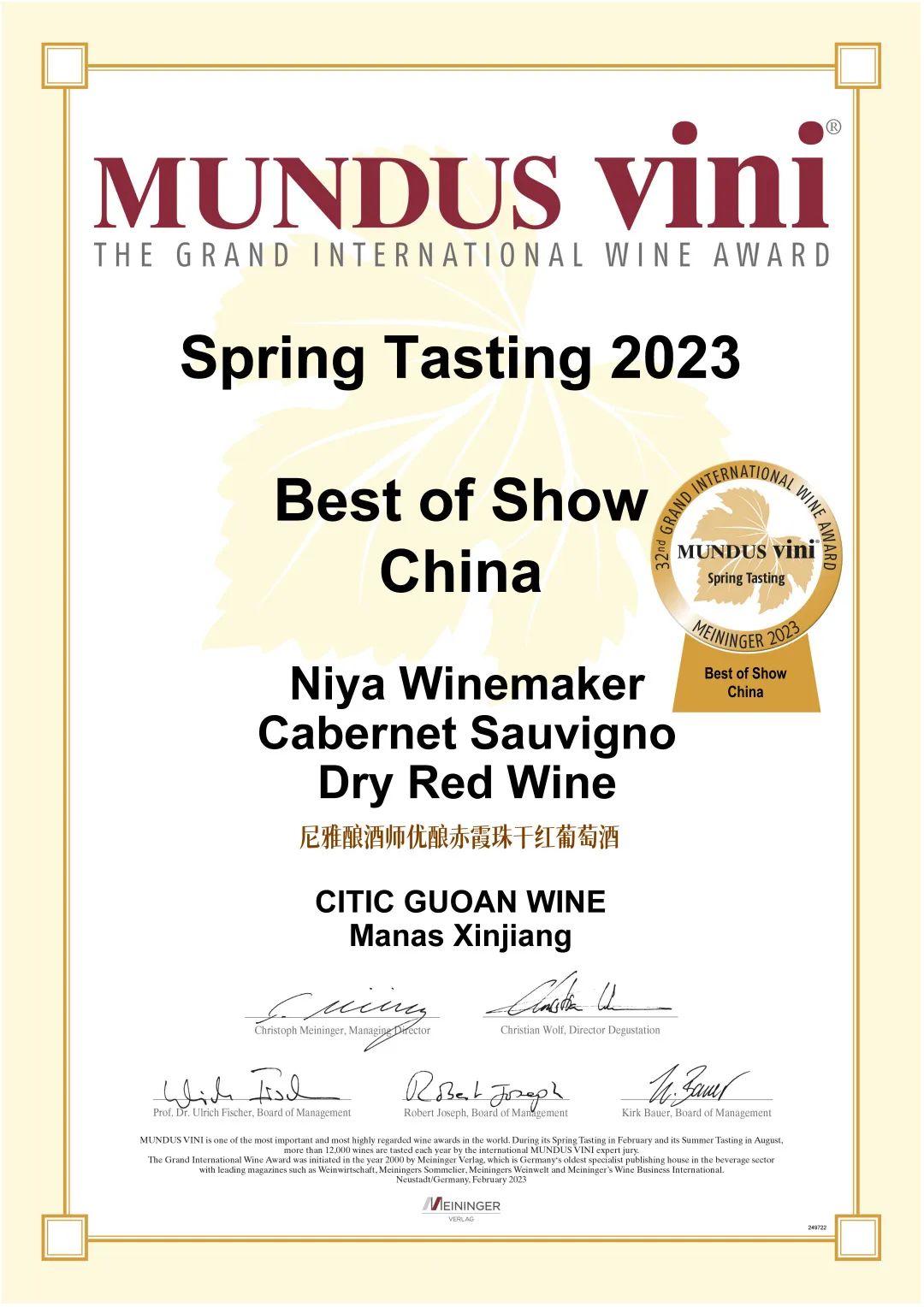 在最近刚刚结束的2023MUNDUS VINI德国国际葡萄酒大奖赛中,尼雅品牌葡萄酒摘得最高奖大金奖,并获评“最佳中国葡萄酒”称号。这正是源于坚定的技术自信与产品自信。