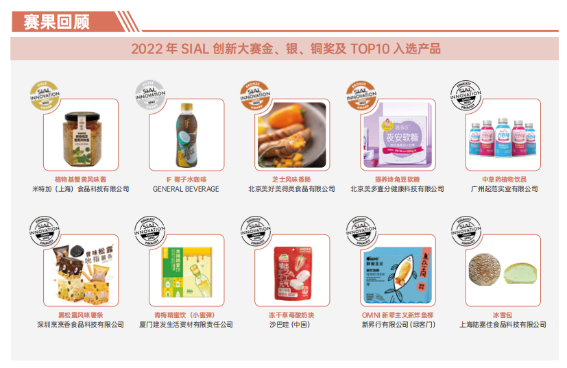 植物蟹黄酱、椰子口味咖啡、奶酪猪肉肠、芥末海苔雪糕、乳铁蛋白水、植物切片牛肉、鲜花脆、固体枇杷膏、无醇啤酒果醋……,过去的比赛中,SIAL 创新大赛放眼全球,从愉悦、健康、保健、便捷、环保五大维度出发通过关注产品本身,将一批符合市场需求的真正的创新食品和饮品带入到大众的视野。