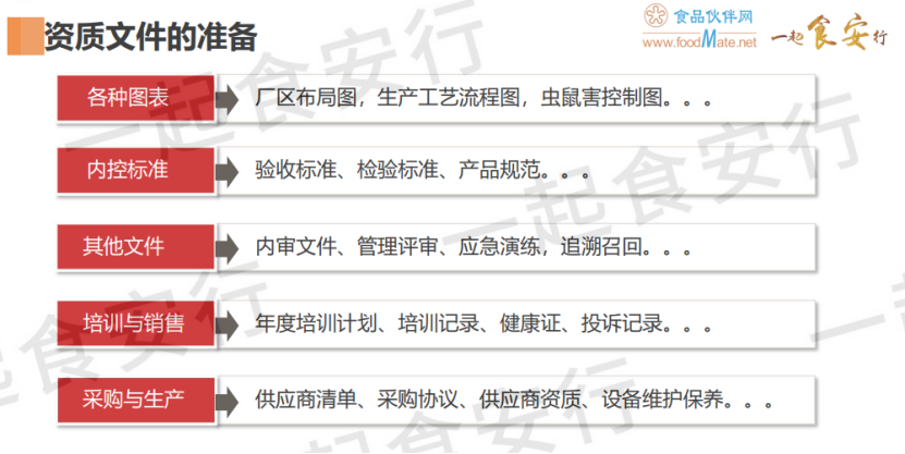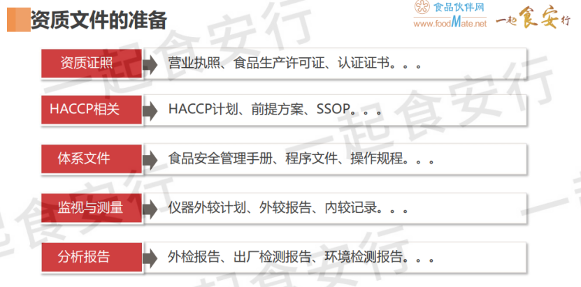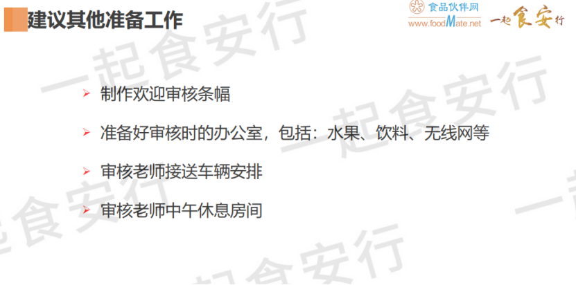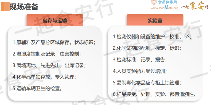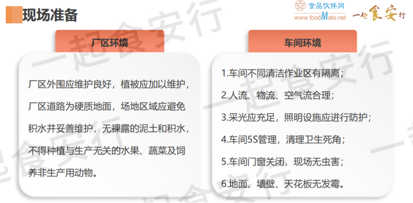 现场准备是尤为重要的环节,需要关注厂区环境、车间环境、人员卫生健康、设备设施能力、储存运输管控、实验室管理、虫害控制、加工过程控制、加工过程控制等。