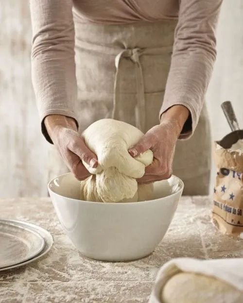 拍上手粉在桌板上轻柔成圆,以双手戳高,排于烤盘上,轻盖静置二次发酵约20-30分钟(面团约发酵成2倍大)