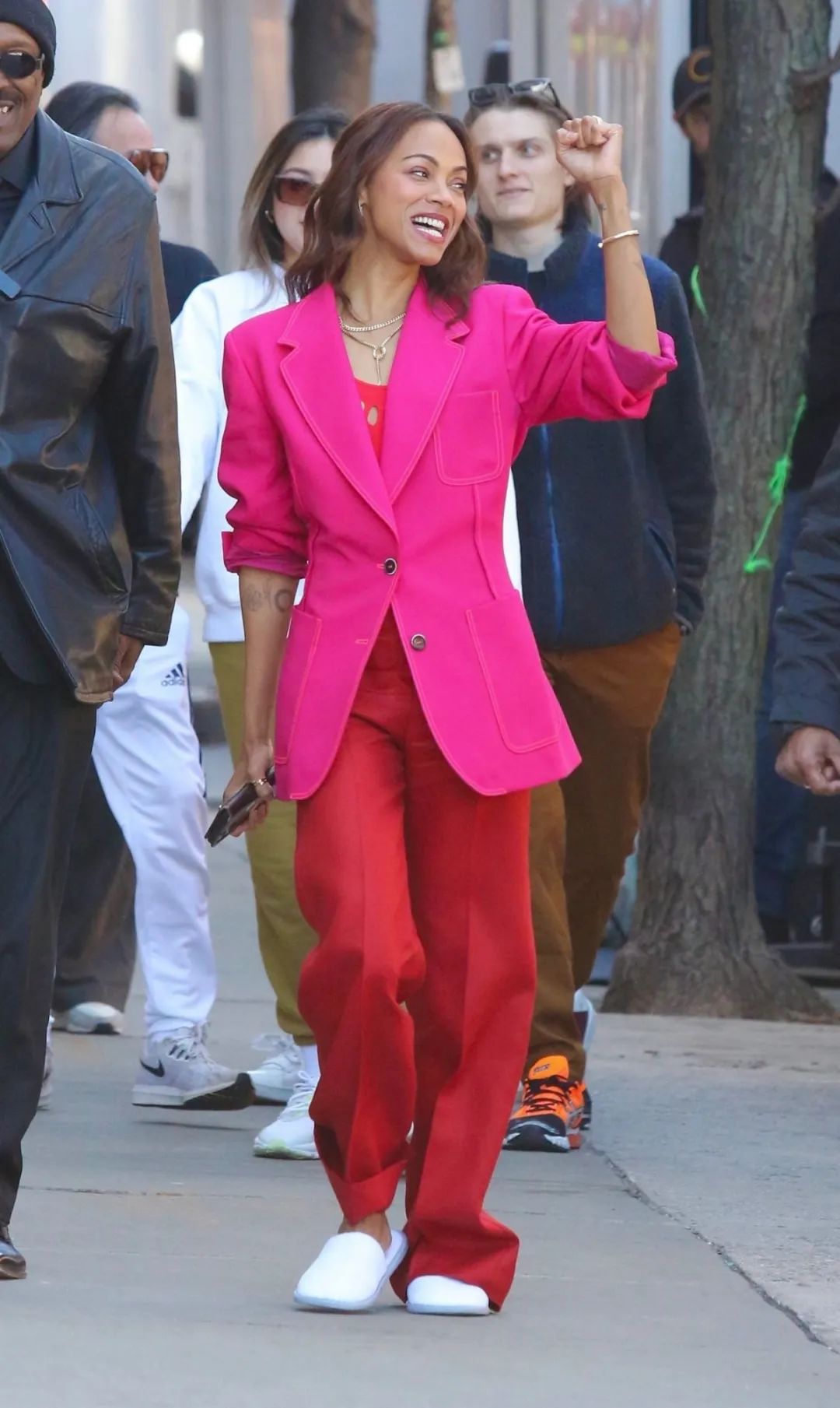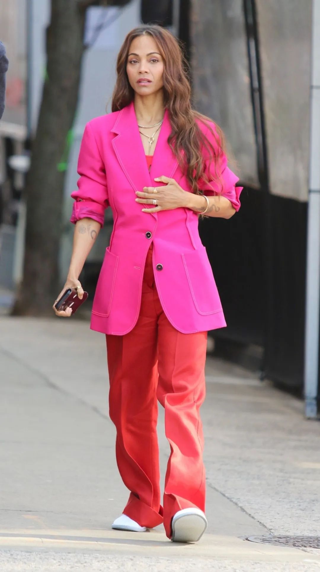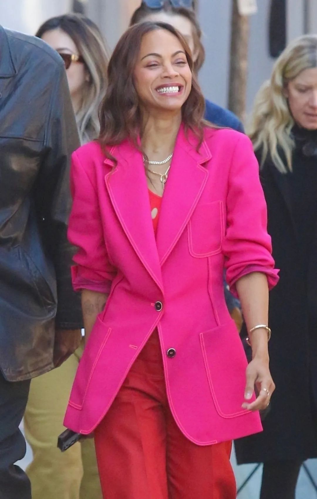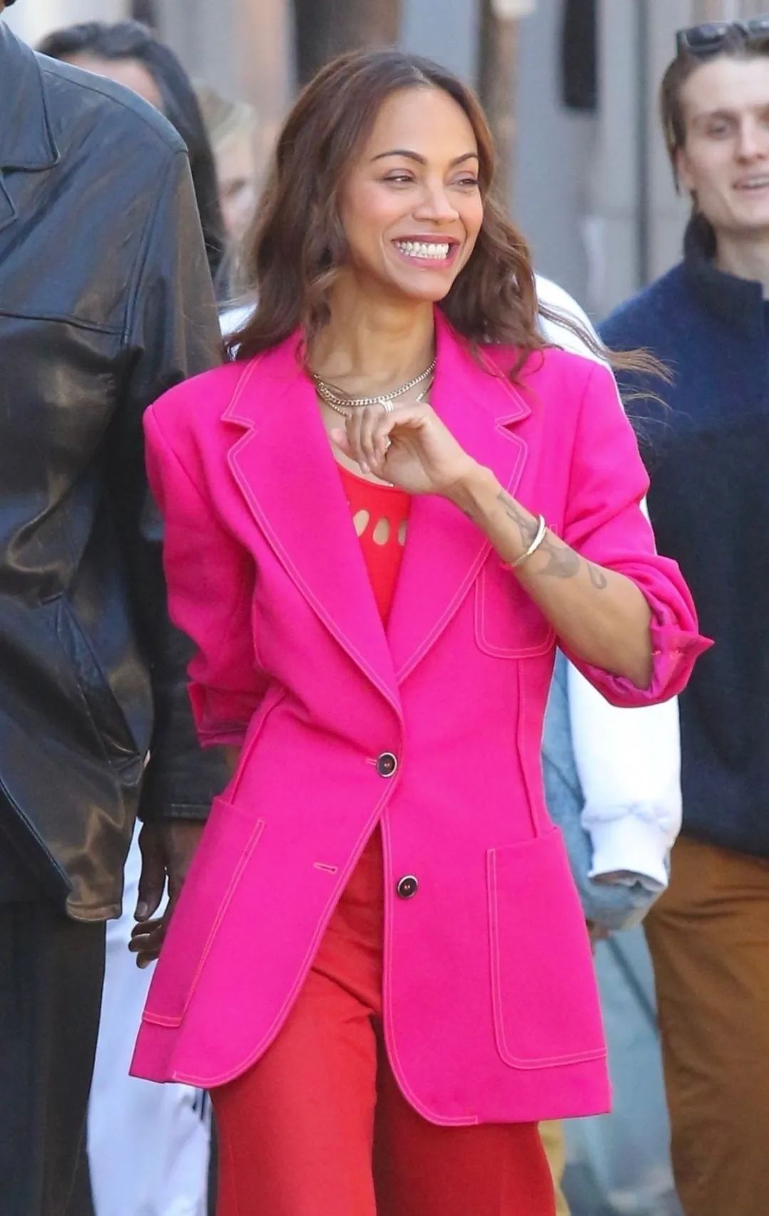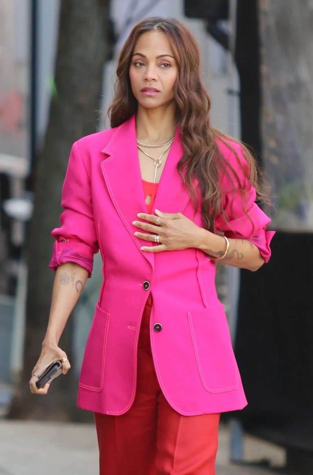 街拍丨佐伊·索尔达娜在纽约为某啤酒品牌拍摄广告