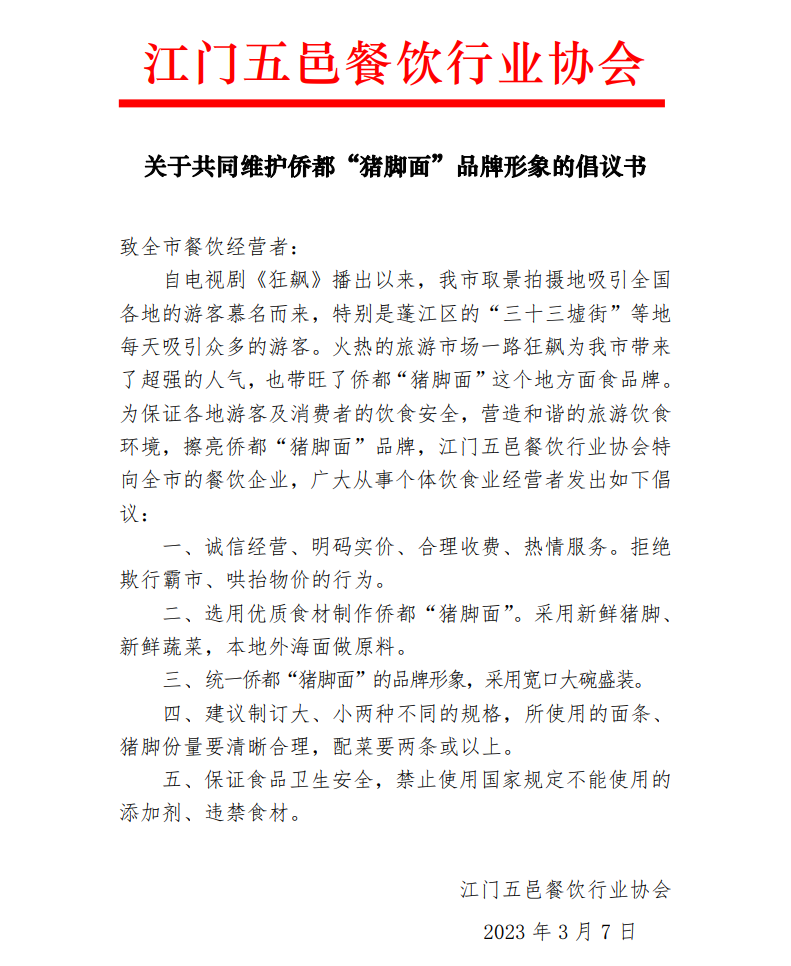 江门五邑餐饮行业协会发起共同维护侨都“猪脚面”品牌形象倡议书