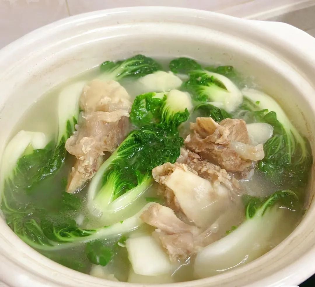 用料以新鲜猪肘骨,小白菜为主,小白菜是含维生素和矿物质最丰富的蔬菜之一,有助于增强机体的免疫力;猪肘骨可以滋养脾胃提供血红素和促进铁的吸收。味咸汤醇、滑润清鲜、营养丰富、味道鲜美。