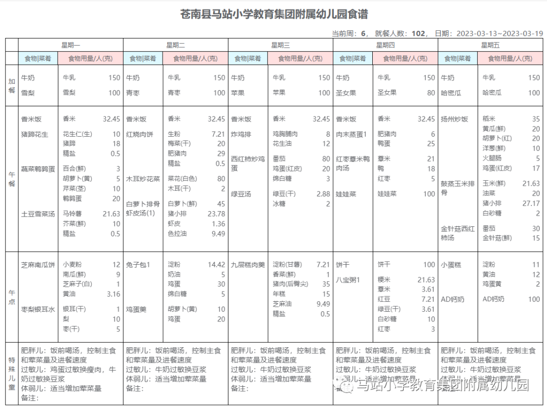 我们每一餐都秉持幼儿膳食“全面、均衡、营养”的原则,根据季节挑选当季时令瓜果蔬菜、新鲜水果、蔬菜、肉蛋奶、谷物等,含丰富的膳进行科学配比,制定每周营养食谱,每周更新。