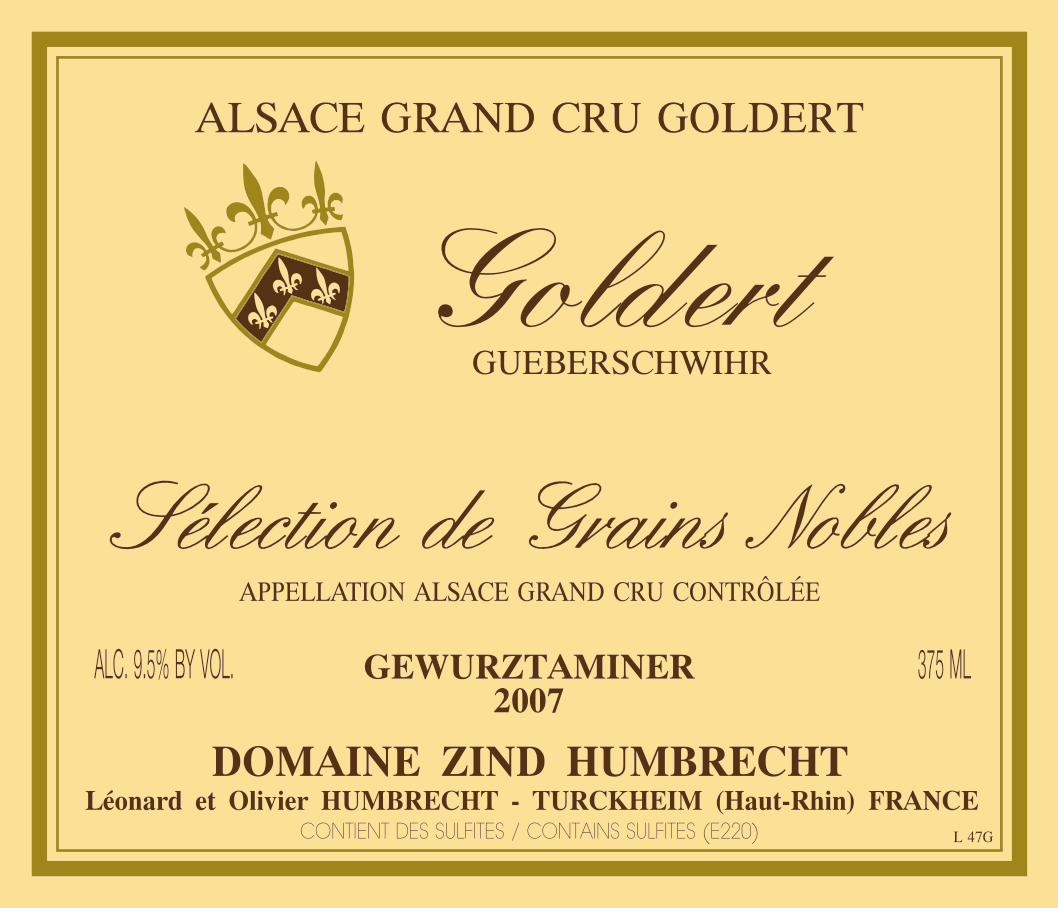 Vendange Tartive, 晚采收。⽤晚采收葡萄酿造的葡萄酒,也有可能使⽤部分贵腐葡萄,必须⽤四⼤贵族葡萄品种酿造。可以标识在Alsace AOC或Alsace Grand Cru 的酒标上。Sélection de Grains Nobles,精选贵腐葡萄酒。完全采⽤贵腐葡萄酿造,必须⽤四⼤贵族葡萄品种酿造。可以标识在Alsace AOC或Alsace Grand Cru 的酒标上。