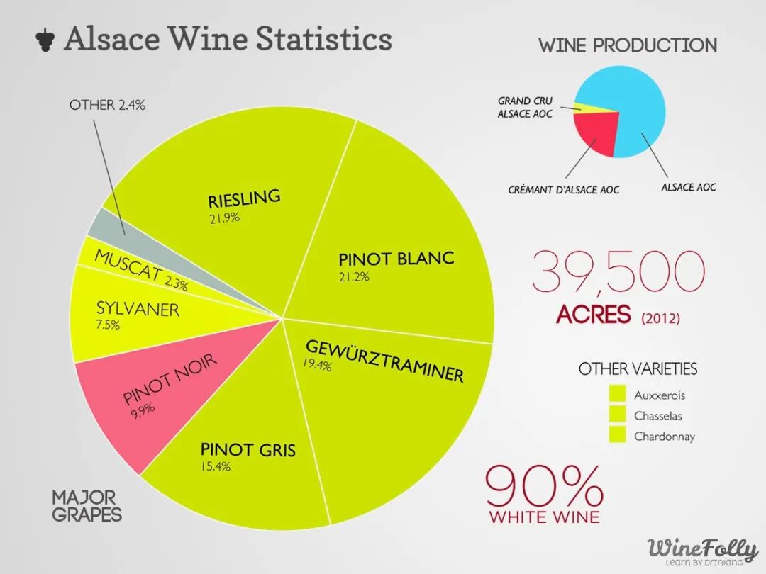阿尔萨斯是法国的⼀个葡萄酒产区,位于法国东北部,和德国接壤。这⾥已出产⾼质量的⽩葡萄酒闻名,从⼲型到甜型都有。这⾥有着众多的葡萄品种,但最为重要的是雷司令(Riesling)葡萄。在阿尔萨斯,没有IGP(地区餐酒)的产区,全部都是AOC级别。阿尔萨斯90%的葡萄酒是⽩葡萄酒。
