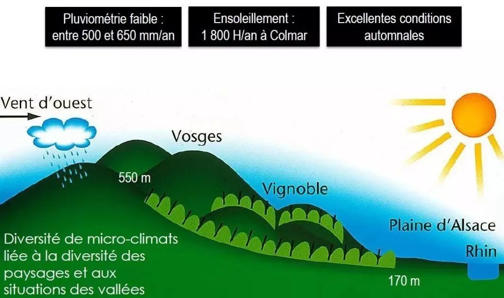 阿尔萨斯位于法国东北部,北纬47-49度,是法国最靠北的产区之⼀,仅次于⾹槟产区。是⼤陆性⽓候,四季变化分明,冬季寒冷,夏季炎热。春、秋季节可能会受到霜冻的影响。阿尔萨斯⻄侧是孚⽇⼭脉(Vosges Mountain),⼭脉阻挡了来⾃⻄边⼤⻄洋的影响,阻挡了云层和降⾬。这⾥⽓候⼲燥、⽇照时间⻓,使得这⾥有着优良的葡萄种植环境,病⾍害困扰较少,⾮常适合有机葡萄的种植。优质的葡萄通常来⾃于⼭脉⼭脚下的⼭坡上,朝南或东南⽅向,这样也使得葡萄在这么⾼纬度的地区可以获得很好的成熟。同时在⼭坡上的葡萄树也避免了霜冻的威胁。