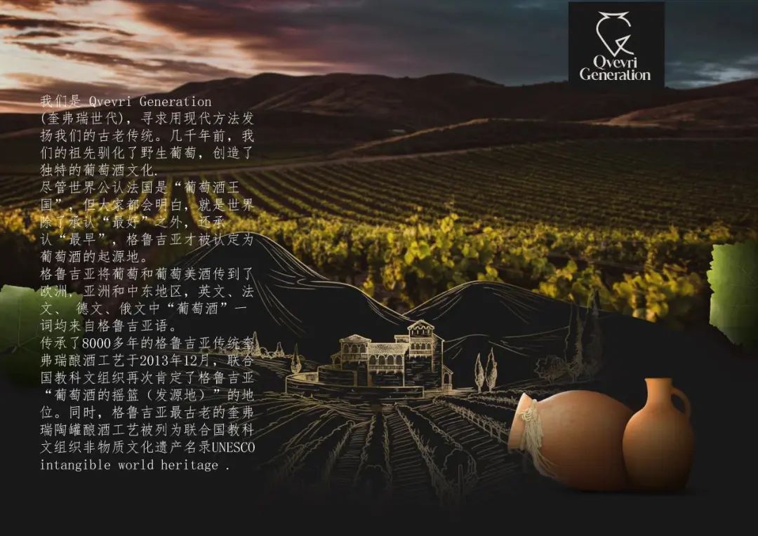 Qvevri Generation(奎弗瑞世代)一直寻求用现代方法发扬格鲁吉亚的古老传统。八千年前,格鲁吉亚祖先就会种植野生葡萄并创造独特的葡萄酒文化。格鲁吉亚创造了葡萄酒,被历史学家认定为葡萄酒的起源地。