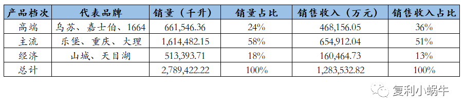 自2020年开始,公司根据消费价格将产品分为高端、主流和经济3个档次,其中10元以上为高档,6-9 元为主流,6元以下为经济,可满足消费者在不同消费场景和价格区间的消费需求。