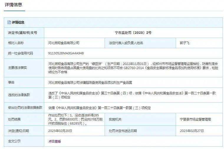 文号“宁市监处罚〔2023〕2号”行政处罚信息显示,河北吉翔食品有限公司生产的“绿豆饼”(生产日期:2022年11月01日),经郑州市市场监督管理局监督抽检,防腐剂混合使用时各自用量占其最大使用量的比例之和项目不符合 GB2760-2014《食品安全国家标准食品添加剂使用标准》要求,检验结论为不合格。违反了《食品安全法》第三十四条第(四)项。