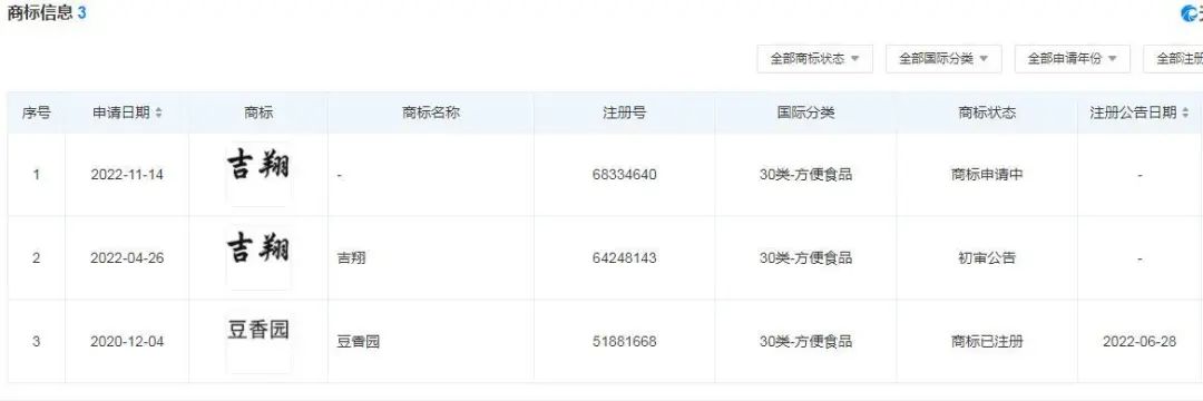 公开资料显示,河北吉翔食品有限公司成立于2021年4月25日,注册地址位于邢台市宁晋县唐邱镇南马庄村村南,拥有“豆香园”等商标信息。