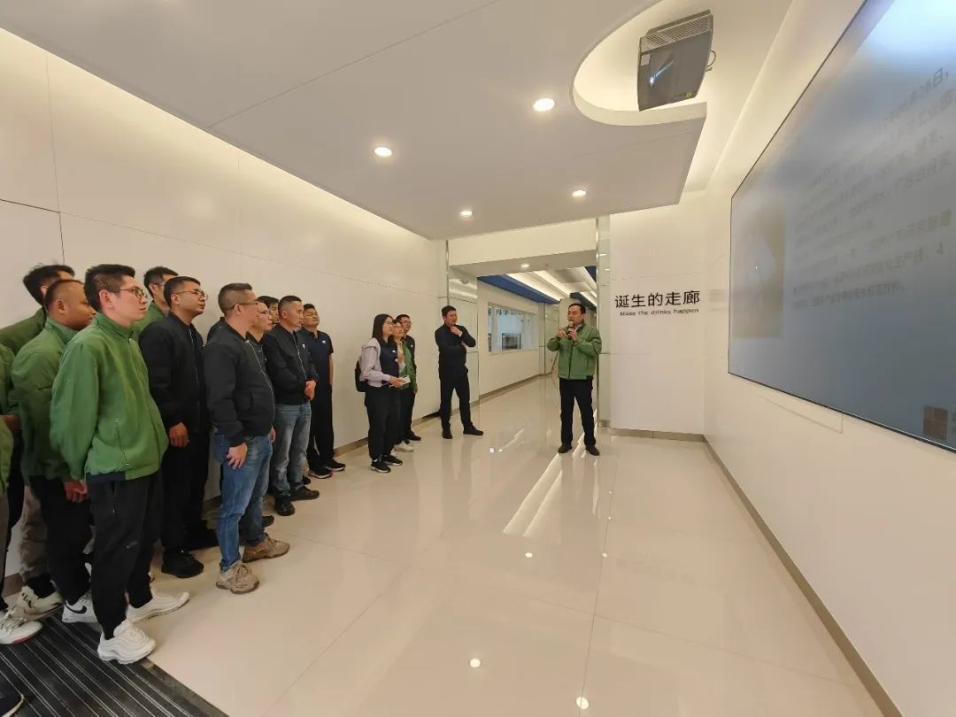 首先,张鸿辉厂长对行销公司员工们的到来表示热烈欢迎,并对工厂情况做了简单介绍。随后走进参观通道,依次参观了企业文化走廊,给大家讲解了各生产线情况及对饮料生产过程和设备原理。