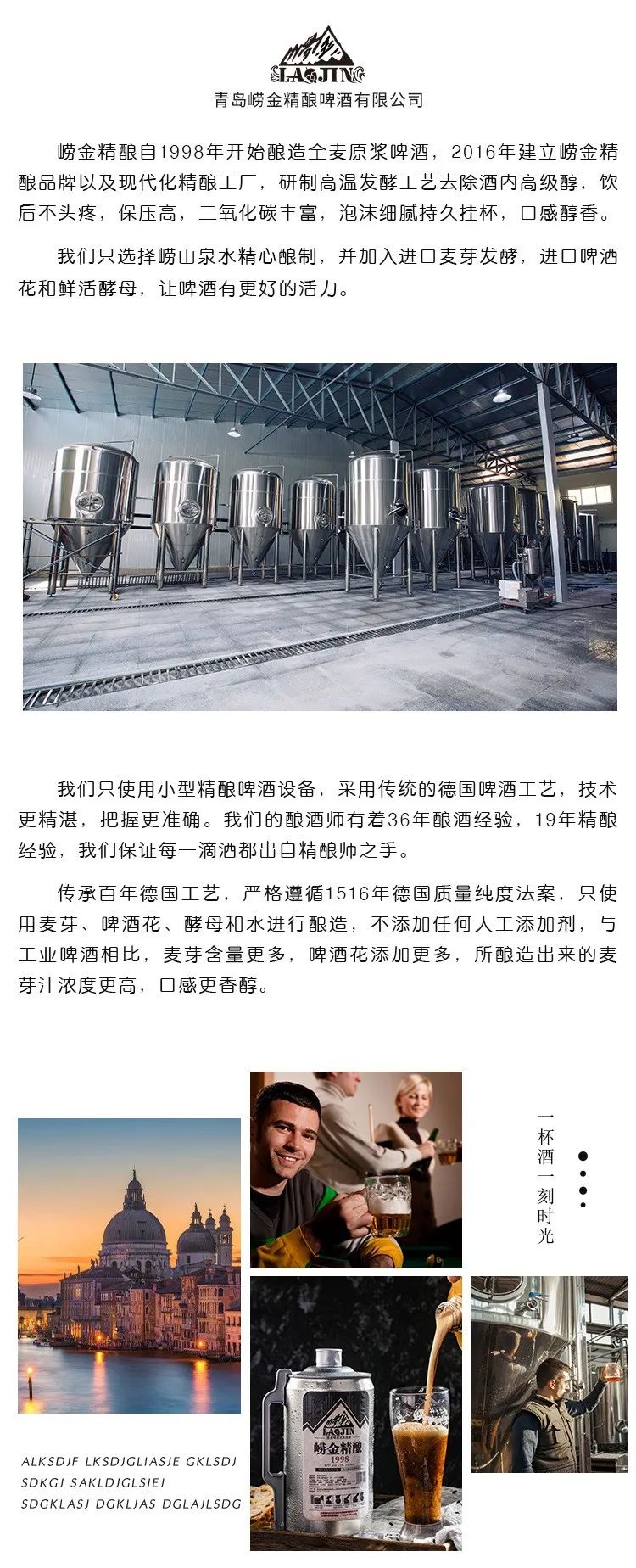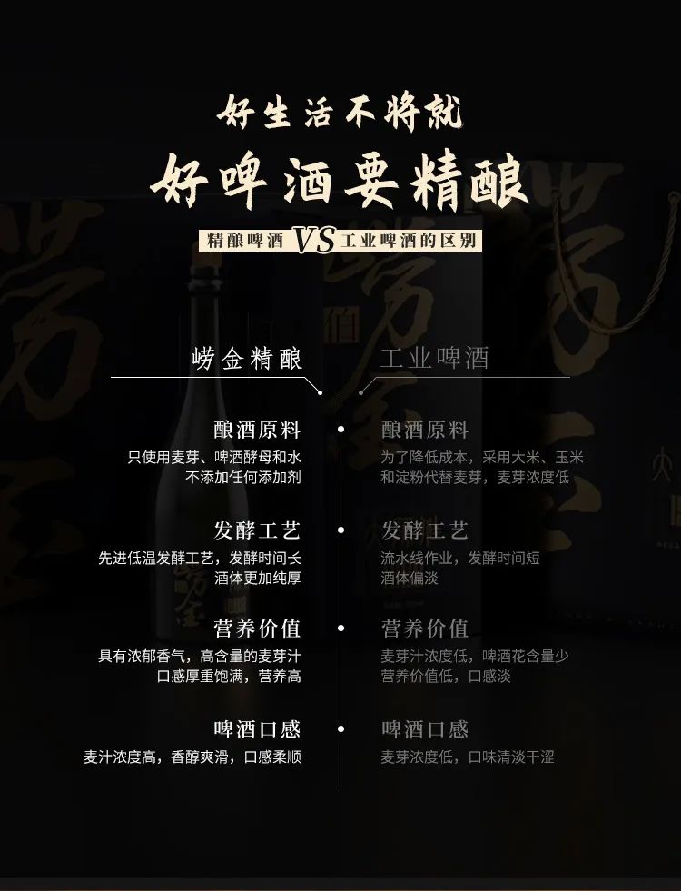 青岛崂金精酿啤酒传承百年德国工艺,严格遵循1516年德国质量纯度法案,只使用麦芽、啤酒花、酵母和水进行酿造,不添加任何人工添加剂,与工业啤酒相比,麦芽含量更多,啤酒花添加更多,所酿造出来的麦芽汁浓度更高,口感更香醇。