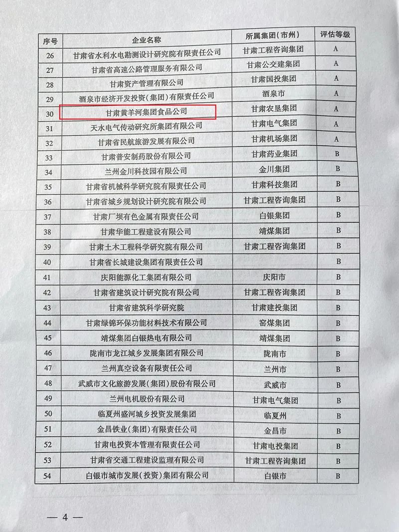 近日,甘肃省国资国企改革推进工作领导小组办公室公布了全省“综合改革示范工程”企业专项评估结果,黄羊河集团食品有限公司荣膺“综合改革示范工程”A级企业榜单。