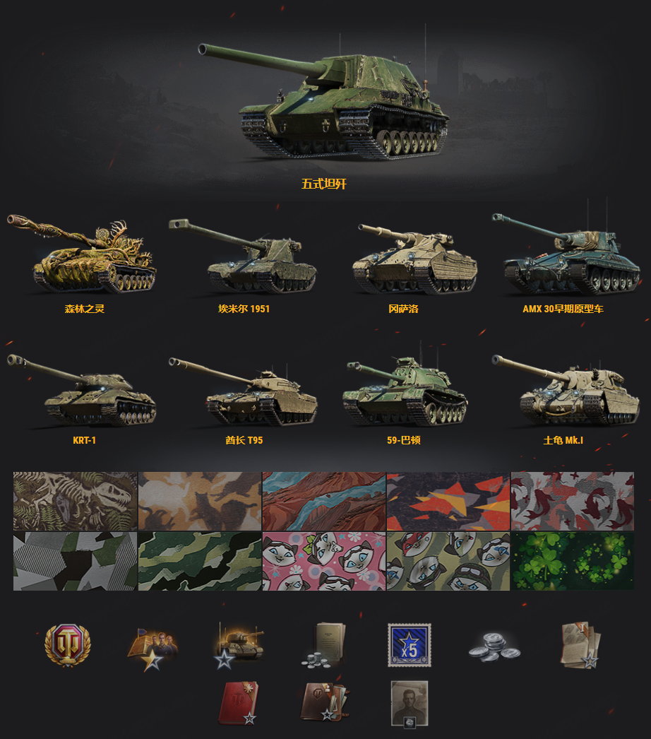 四叶草补给箱奖励池中您需要特别留意的坦克包括:五式坦歼,一辆擅长突击的R系VIII级自行反坦克炮;森林之灵:久经沙场的S系自行反坦克炮SU-130PM很擅长伏击战术,该变体的全新外观会令人联想到翠绿的丛林和德鲁伊的吟唱。