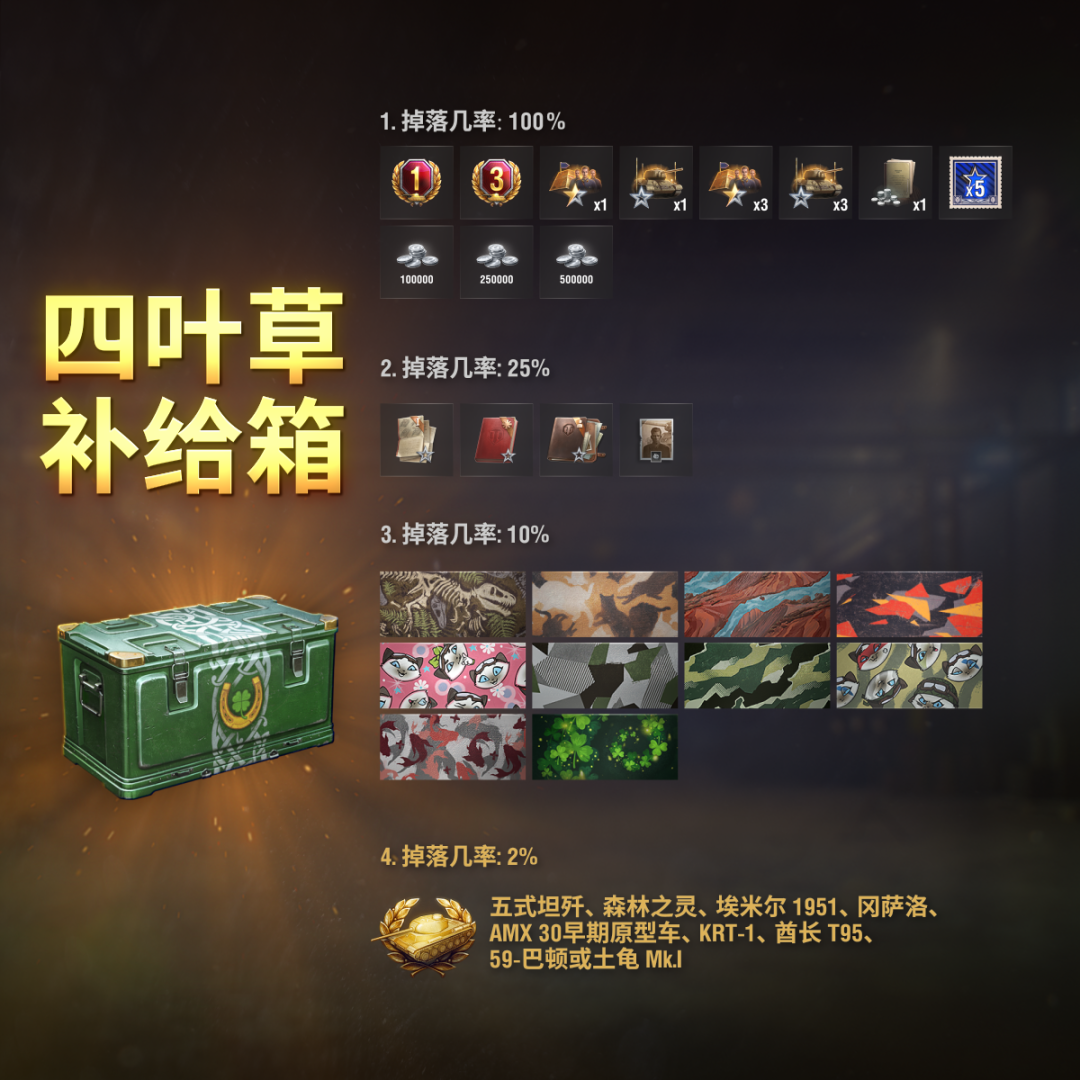 每开启50个四叶草补给箱将保底掉落上述9辆金币坦克之一。如果坦克在开启第50个补给箱之前掉落,计数器将会重置。