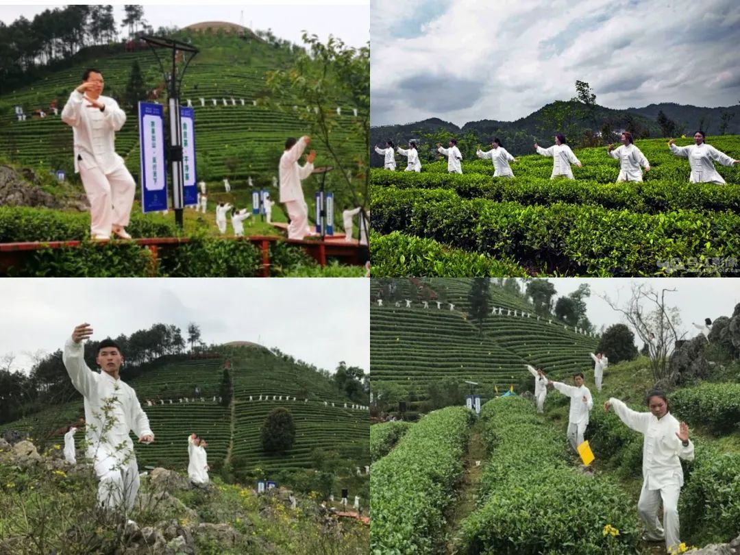 活动内容:余庆县太极运动协会组织170名太极运动爱好者,在二龙拉膜会场集中表演,在木栈道、茶里行间分散表演。