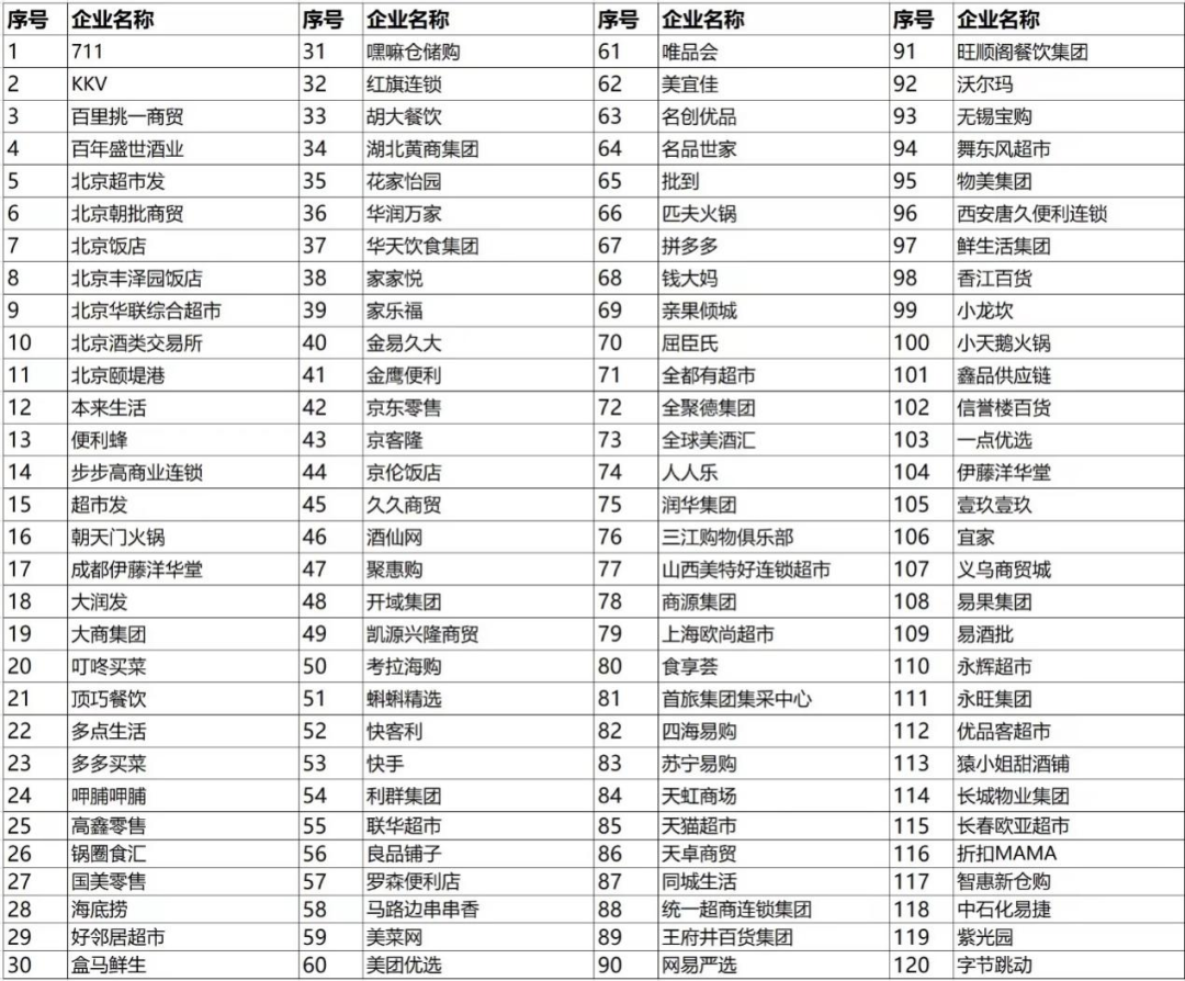 拟邀成员:首旅集团、沃尔玛、唯品会、京东零售、盒马、华润万家、华致酒行、商源集团、高鑫零售、金易久大、来伊份、KK集团、成都伊藤洋华堂、美团优选、叮咚买菜、海底捞、呷哺呷哺、紫光园、小龙坎、拼多多、天猫、考拉海购、家乐福、京客隆、永辉超市、物美集团等。