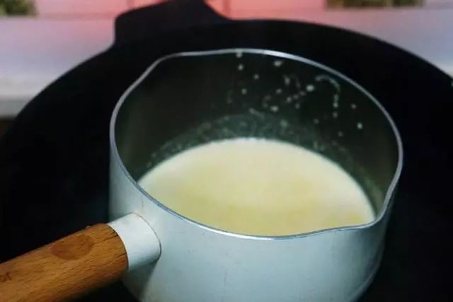 4.然后先加三分之一已经泡软的吉利丁片,加好拌匀。再加热牛奶吉利丁。
