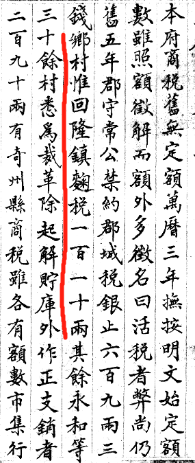 明代内阁大臣安阳人郭朴所编写的《彰德府志》如此记载,本府商税旧无定额,万历五年,郡守(指知府)常存仁禁约郡城税银止六百九两三钱,乡村惟回隆镇曲税一百一十两,其余永和等三十余村悉为裁革。彰德府知府常存仁在万历五年(1577年)做出规定,府城安阳城的商税收至六百零九两三钱就不再征收,乡村除了回隆镇征收曲税一百一十两,其余三十余村均不再征收商税。