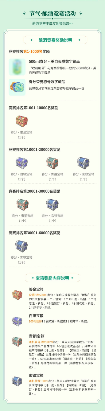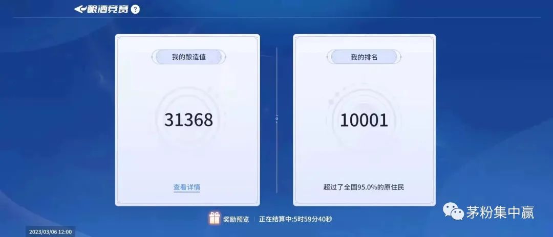 贵州茅台酒二十四节气春系列之“春分·酿酒竞赛”活动于3月15日8点正式开启!对比立春、雨水、惊蛰,酿造竞赛可以说是愈发激烈,门槛愈发高涨,同样氪金成本也越来越大!不管是老玩家还是新玩家,想要挤进前10000名难度不小(惊蛰竞赛前1万名门槛31368分左右),你准备好冲锋了吗?