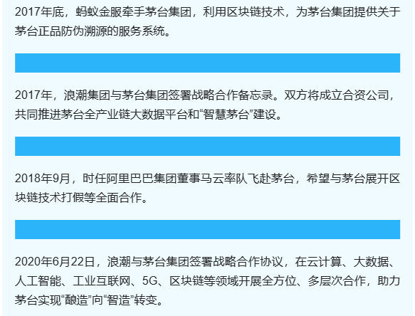 2017年底,蚂蚁金服牵手茅台集团,利用区块链技术,为茅台集团提供关于茅台正品防伪溯源的服务系统。