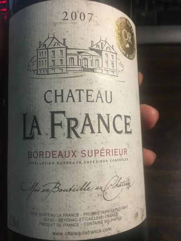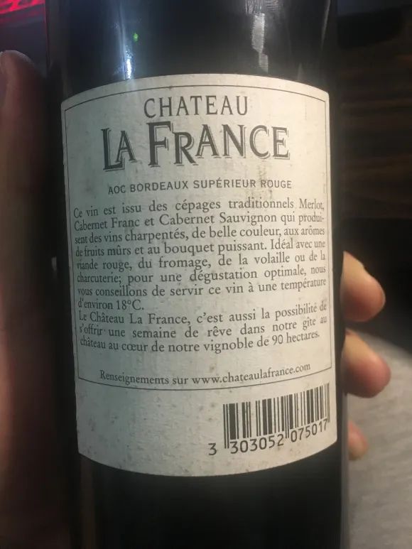 我们看下这款2007年份大拉菲红酒的正标,暂且不看上面漫画风似的城堡LOGO,单看这个显眼的英文“LA FRANCE”,直接翻译过来就是“法国拉菲”,而真正的拉菲英文则是“LAFITE”,经常接触拉菲红酒的稍微对比一下英文标就知道这酒肯定是假的了!