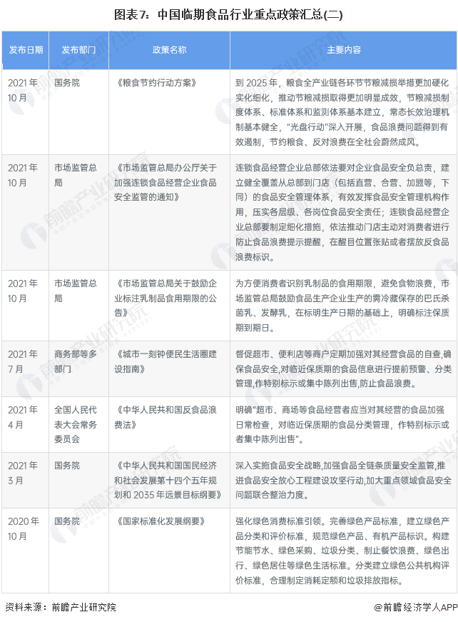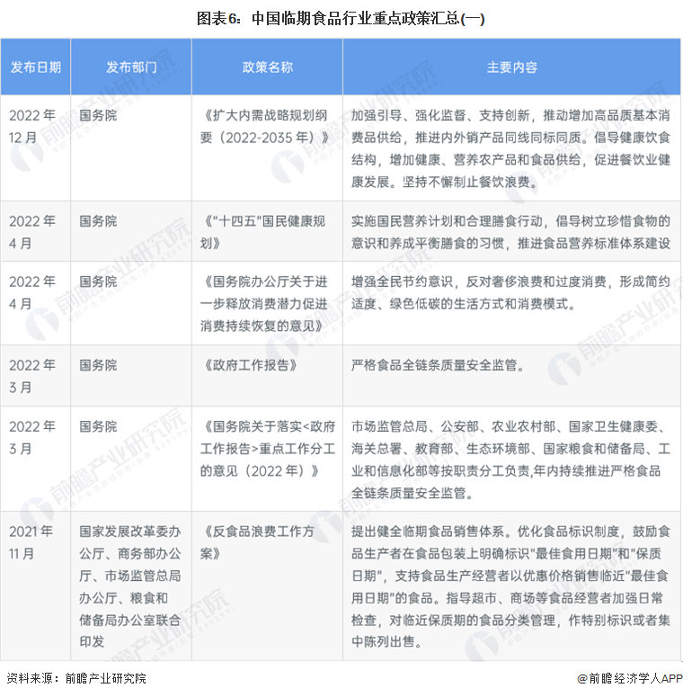 目前,国家层面尚未出台临期食品的专项政策,但关于临期食品处置和食品浪费等问题早已渗入我国多项重要文件。2021年4月29日,《中华人民共和国反食品浪费法》开始施行,其中明确提出超市、商场等食品经营者应当对其经营的食品加强日常检查,对临近保质期的食品分类管理,作特别标示或者集中陈列出售。