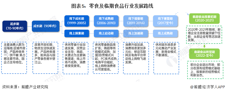 分析临期食品的大环境,首先分析我国的零食行业发展阶段,零食行业的发展与我国经济发展和居民消费水平息息相关,近年来随着线上电商的发展,线下零售渠道经历了一轮调整重塑期;而临期食品作为我国零食行业调整阶段的新兴业态,自2020年开始崛起,一度收到资本追捧,目前已经历了3年的探索和洗牌。