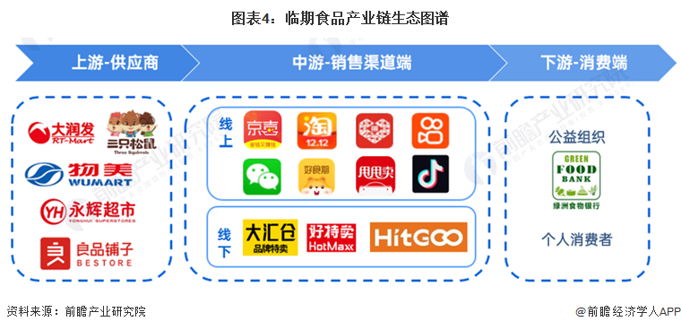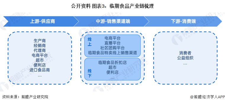 临期食品行业产业链主要分为三个部分:上游供应端、中游渠道端、以及下游的消费者和公益捐赠组织。其中,上游供应端主要为食品生产商、经销商、代理商、线上销售渠道如各大电商平台、大型超市、进口食品商等,这些供应商的库存和尾货商品通过中游销售渠道端,包括各大电商平台、临期食品特卖线上渠道、临期食品折扣店、连锁商超、便利店等,以销售或者赠与的方式流向消费者和公益组织捐赠对象。