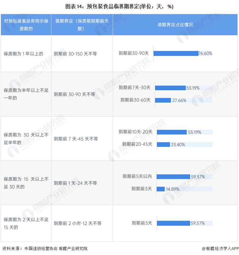 以预包装食品临界期界定为例,根据中国连锁经营协会调查发现,几乎所有超市企业都对预包装食品有相关临期管理措施;但对于临期时间的界定差异较大,规则不统一,因此,临期食品行业若想进入稳定健康发展阶段,必须首先建立起统一规范的界定和管理条例。