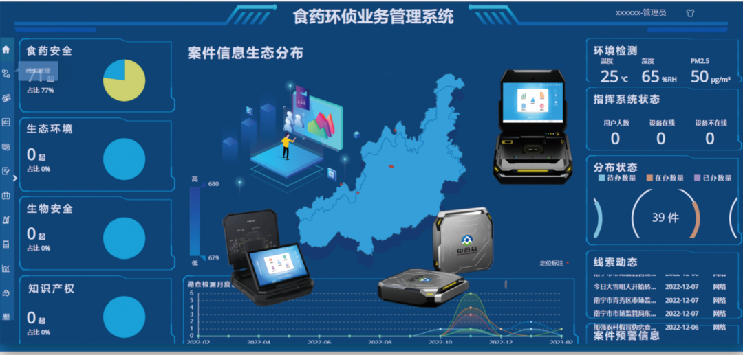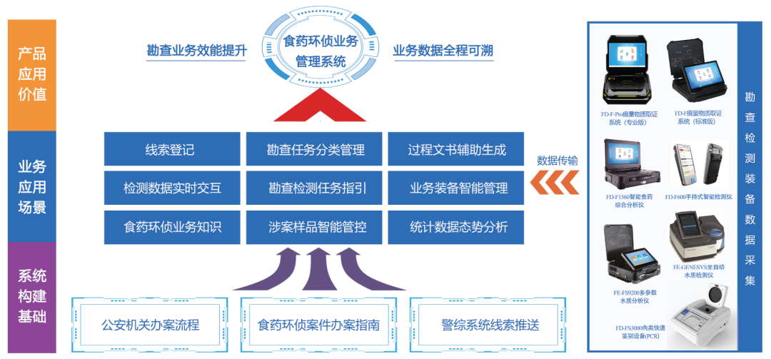公司基于卓越的开发能力,日趋专业化的执法环境,开发并上线执法业务数据管理系统、设备管理平台、综合执法勘验系统、农事记录平台(一品一码溯源)、地力调查系统等专业平台。公司基于精准的检测技术、专业的执法办案经验,打造的食品药品环境现场执法检测取证一体化解决方案,已成功应用于公安院校,市、县(区)各级公安实战单位。产品涵盖食药安全、生态环境、生物安全三大领域,覆盖食品、保健品、水质、空气、土壤、生物等超过100项检测指标,可实现从线索建档>任务构建>勘查实施>数据案件化的勘查取证业务全过程管控。适用于食药环侦多场景应用需求,能够实现现场采样、即刻分析、全程留痕、证据固化,有效提升公安机关食药环侦办案效能。