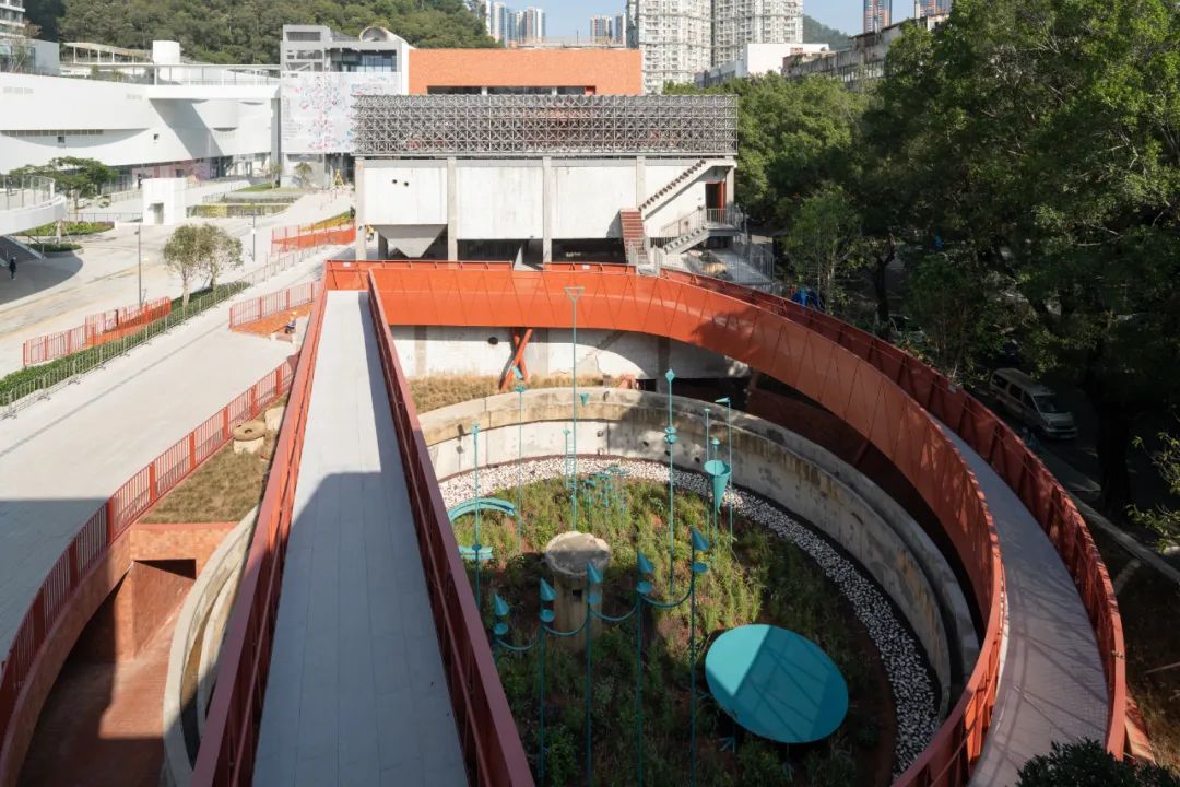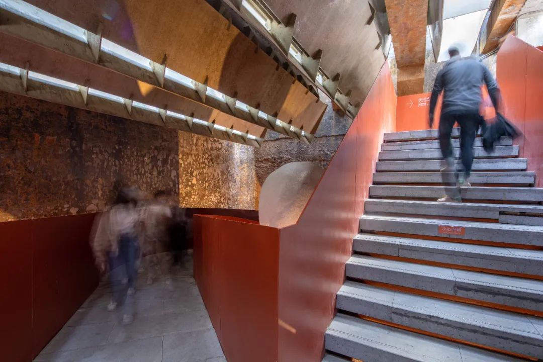 金啤坊以保留现状混凝土建筑和节点性空间介入为主要的改造手段,评估每一栋建筑并进行个性化改造,介入不同空间实现功能置换,通过保留的楼梯、桥梁和新增步道将其衔接,让观众置身其中与周边互动。二期污水处理站内部的楼梯 ©ParticlePlus空间动线的设计结合了啤酒厂的建筑特色。观众环绕废弃的沉淀池,通过两条路径往返于一期污水处理池和二期污水处理站。走在二期污水处理站中的旋转楼梯,观众可以更加亲近建筑的内部,沉浸式体验整个空间。