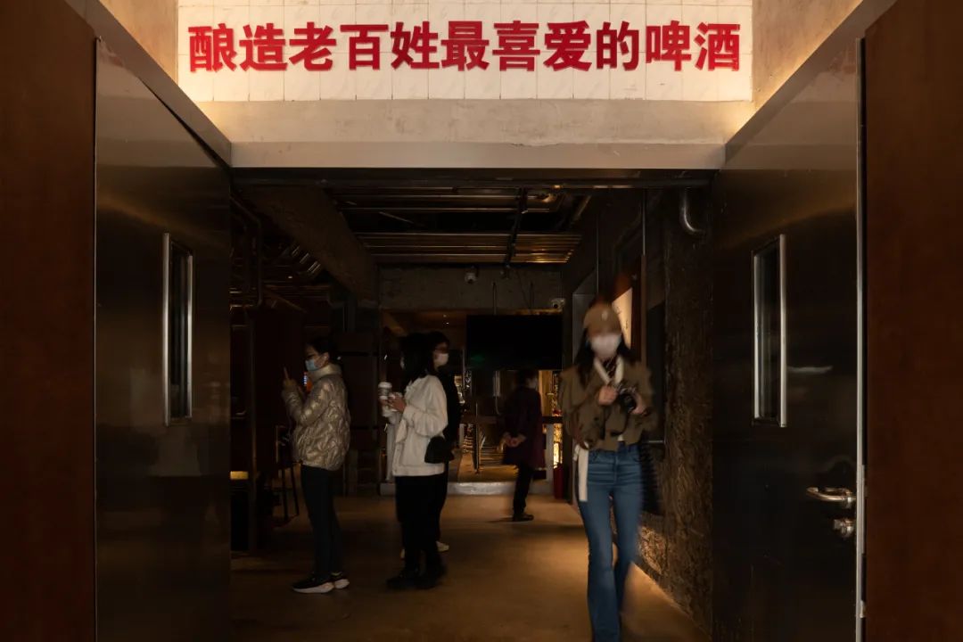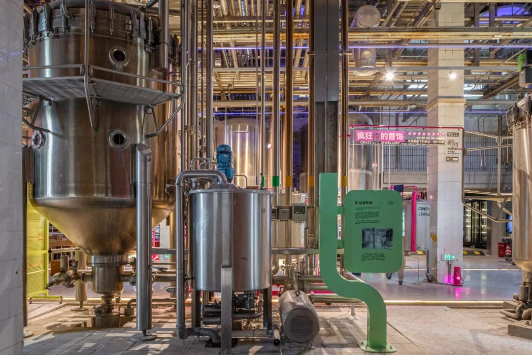 展场内遗留的原金威啤酒厂的标语 ©UABB,摄影:胡康榆通过这些史料,附近居民对于金威啤酒厂的记忆可以得到更新。一份金威啤酒报,一本工作证,几张金威啤酒处于巅峰时期的照片,都是真实且生动的。当然,除了教育价值,金啤坊还为附近的居民提供了一个舒适的活动空间。啤酒发酵罐及其下方的户外空间 ©ParticlePlus