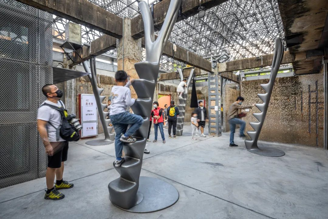 围绕沉淀池的红色廊道,下方为种植、展示本地物种的《种子花园》️©UABB,摄影:胡康榆在新旧空间的交替中,金啤坊悄然完成从啤酒工厂到多元文化场域的转变。建筑师雷姆·库哈斯说道,“废弃的工业用地也已经成为最有吸引力的改建场所,因为其卓越的空间姿态可以完美地承载艺术家的挑战和理念。”出于生产的需要,相较于普通的城市建筑,工业建筑有自己的功能属性,也正是这些具备不同功能的建筑,为艺术生产提供了更多可能性。“即地制造-原厂重现”展览现场 ©UABB,摄影:胡康榆本届深双带来了许多与啤酒厂的建筑特点巧妙结合的展品,营造了一个工业+艺术的氛围,同时还给人带来许多与城市空间有关的思考。在展览中,观众能以全新的视角观察建筑,探索这些具有不同功能的建筑为艺术创作带来的可能性。“疯狂的首饰”专题展展品之一 ©ParticlePlus如本届深双带来的“疯狂的首饰”专题展,设置在啤酒发酵罐所属的这栋建筑内部,这里是当时的啤酒过滤车间,有许多运输管道、过滤罐作为配套的啤酒生产设备,展品的进入为这个过滤车间内部的工业气息注入了新的生命,展品本身的跨界亦是这个空间的跨界。一期污水处理池的户外空间 ©ParticlePlus将视线放到开放的展览空间中,也能看到展品及空间的互动。《城市寄生家具计划》作品一角 ©ParticlePlus“物灵之旅”板块的策展人便在一期污水处理池带来了许多与环境本身互动的装置。在这个开放的展览空间,有许多分布在阶梯上的桌椅,一张桌子可以横跨四五级阶梯。通过等比例放大普通家具,将其置于城市空间,给观众营造了一种家的感觉。空间和居民并不是完全独立的两部分,而是共生关系。逛展逛累了就坐着休息的观众,在展场里探索的儿童,这些场景自然也成为了展品的一部分。《一人 众灵 呼吸》作品一角 ©ParticlePlus以作品《一人 众灵 呼吸》为例,当儿童看到可以爬的“楼梯”,似乎本能的反应就是往上爬。每上一级“楼梯”,他们都站在了不一样的高度。这给儿童提供了一种通过主动探索获得另一种观看空间的体验。而在一旁观看整个探索过程的观众,自然也获得了另一种观展体验。从金威啤酒厂的改造和本届深双的策展可以看到,工业遗存可以在无限的可能性中重获新生。金威啤酒厂曾经提供了啤酒这一大众消费品,但它也有生命,在后工业时代,它的城市记忆应该被看见。曾经深度参与深圳人日常生活的金威啤酒,不仅只是一段奋斗史,还是一代深圳人的共同记忆。原金威啤酒厂的发酵罐车间北楼,如今被改造成一个常设展览空间,用于呈现金威啤酒厂的历史,罗湖居民的回忆。