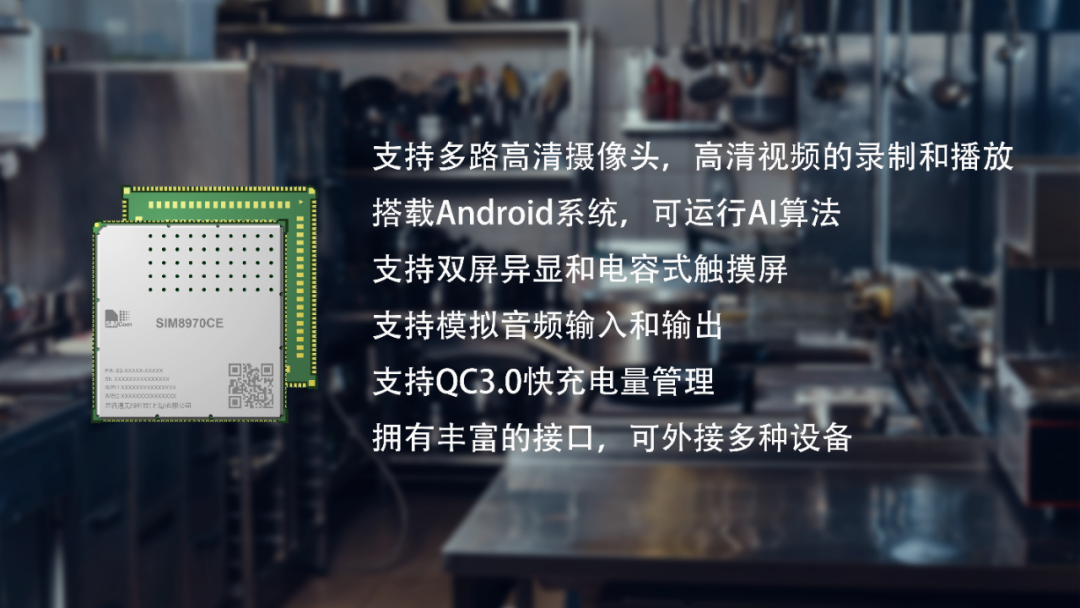 SIM8970接口丰富,可外接摄像头、显示屏、音频、传感器等设备,还支持WiFi和Bluetooth连接和高清显示,实现视频、图片、音频等实时高清传输,画面清晰流畅,能展示更丰富、更清晰的后厨画面细节。应用在餐饮门店电子显示屏中,不仅实时向顾客展示厨房情况,而且能展示推荐菜品和其他内容,做到“一机多用”。