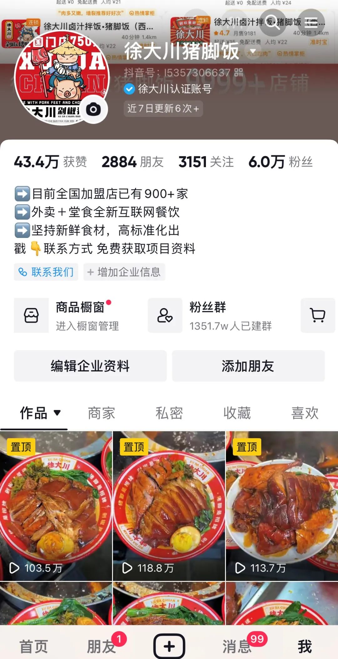 未来餐饮企业要练好内功,私域流量要作为营销的标准配置,打造自己的流量池,才能保证自己的持续活力。徐大川剁椒猪脚饭以自身优质的产品新鲜,在抖音吸粉无数,获得众多客户好评!