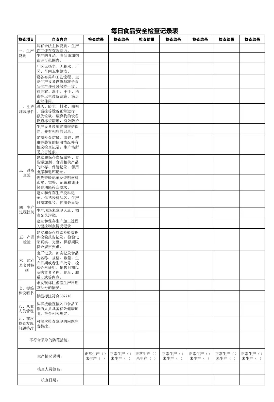 1.4.1正常生产期间,食品安全员每日根据公司《落实食品安全主体责任风险管控清单》进行检查,排查生产加工各个环节可能存在的食品安全风险隐,并将检查结果汇总记录在《每日食品安全检查记录表》上,可采用电子表格的形式予以记录。未发现问题的,也应当予以记录。