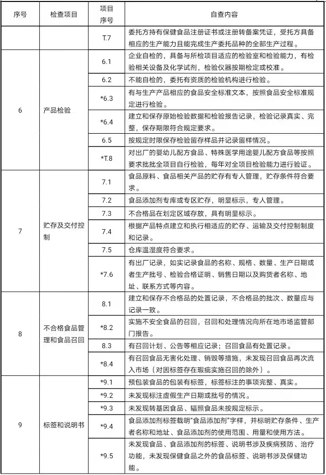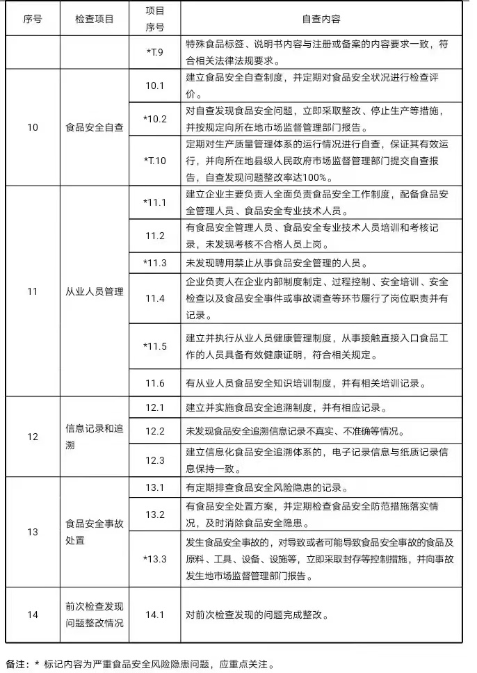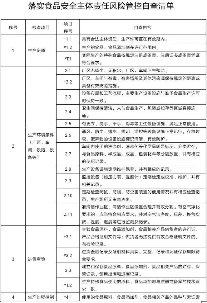 1.3日管控内容日管控检查应覆盖以下内容:生产资质、生产环境条件(厂区、车间、设施、设备等)(★)、进货查验(★)、生产过程控制(★)、产品检验(★)、贮存及交付控制(★)、标签和说明书(★)、从业人员管理(★)、前次检查发现问题整改情况(★),具体参照《落实食品安全主体责任风险管控清单》,其中“(★)”标记项目为重点检查内容。