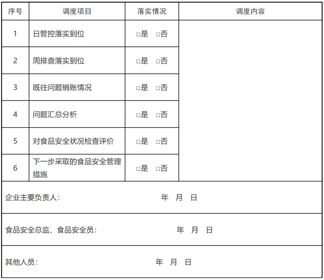 食品生产企业应当结合企业实际,制定本企业风险管控清单,建立健全日管控、周排查、月调度工作制度(示例见附件4),由企业主要负责人、食品安全总监、食品安全员落实日管控、周排查、月调度管理要求。 正常经营期间,食品安全总监、食品安全员等食品安全管理人员要开展监督管理工作。企业食品安全员每日根据风险管控清单(示例见附件3)进行检查,形成《每日食品安全检查记录表》(示例见附件5);企业食品安全总监每周至少组织一次风险隐患排查,形成《每周食品安全排查记录表》(示例见附件6,未达到配备食品安全总监要求的企业,由食品安全员实施);企业主要负责人每月至少听取一次食品安全总监或食品安全员管理工作情况汇报,形成《月调度记录和管理表》(示例见附件7)。