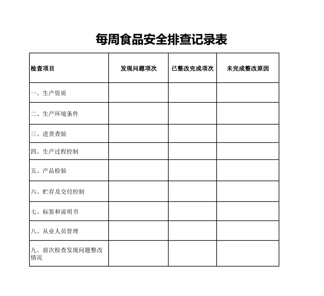 2.4.1正常生产期间,排查可以结合日管控情况、现场自查情况、其他各渠道收集的食品安全信息等,分析研判公司的食品安全管理情况,检讨日管控中存在的问题,对于频繁发生或者存在较高食品安全风险的问题,应制定相应的纠正预防措施,督促相关责任部门落实整改并进行跟踪验证整改结果。周排查应形成《每周食品安全排查记录表》。