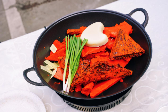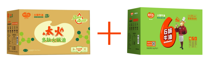 第一款,好脂味浓香牛油火锅——使用的是太火多肽火锅油与6味牛油组合炒制。太火多肽火锅油比普通牛油提升2重脂香4倍肉感,让锅底香味浓郁,肉感十足,口感厚重,油脂对食材附着力强,烫菜更巴味,与6味牛油创新结合,让锅底自带生鲜香味,减少了传统生鲜爆香环节,节约25%的底料炒制成本。