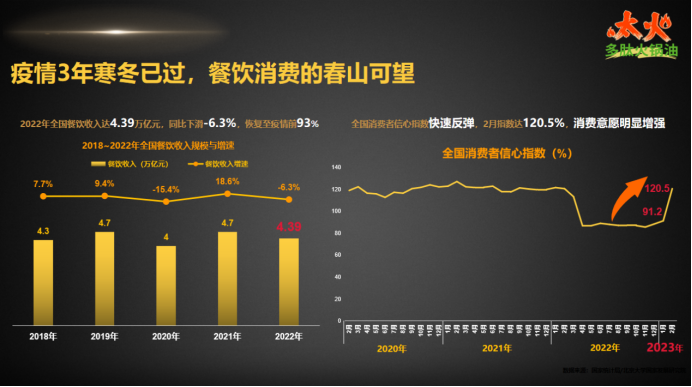 疫去春来,餐饮复苏,据悉,2022年全国餐饮收入达4.39万亿元,已恢复至疫情前93%,全国消费者信心指数快速反弹,2023年2月,指数达120.5%,消费意愿明显增强。