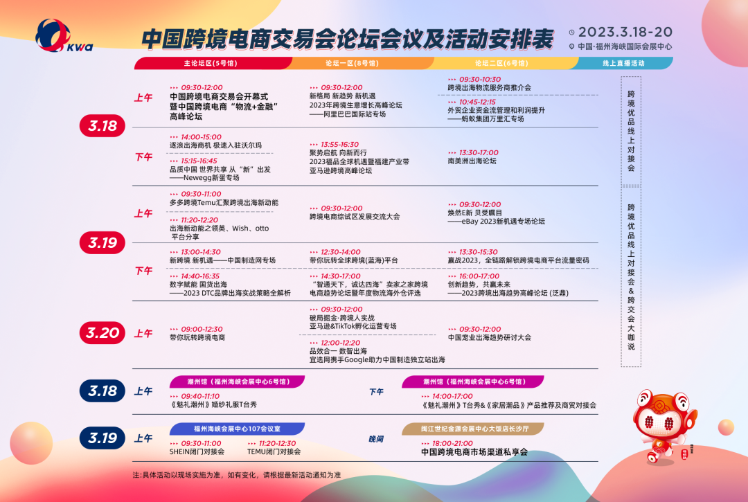 2023中国跨境电商交易会将于3月18日至20日于福州举办。本届跨交会开设跨境电商供货商展区、跨境电商综合服务展区,展会面积7.2万平方米,配套50余场形式新颖,内容接地气的活动。