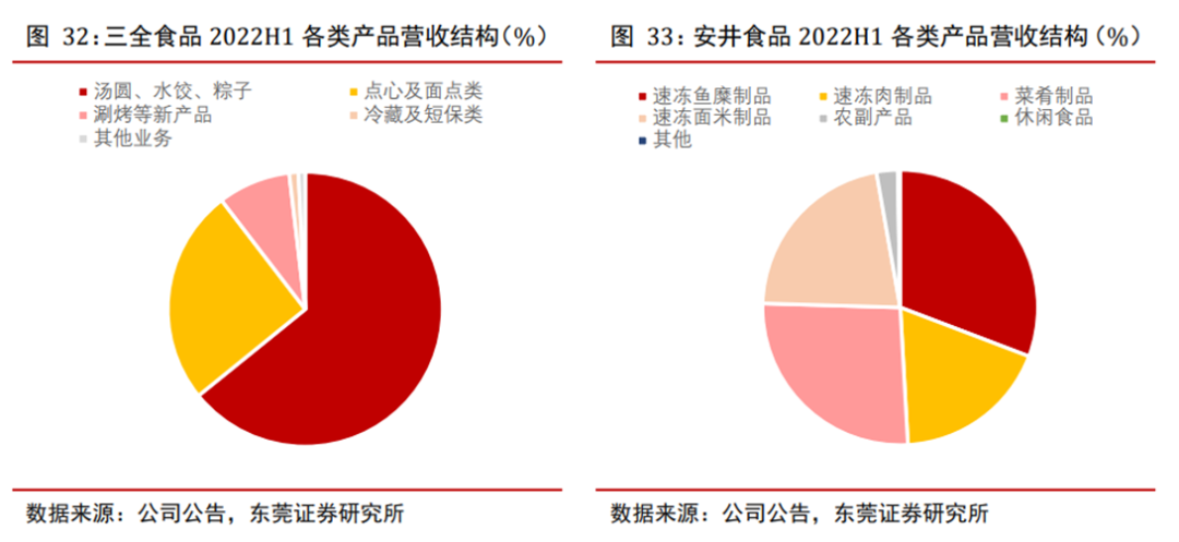 三全食品、安井食品、千味央厨各家2022H1的财报显示:- 三全食品的营收结构中,汤圆、水饺、粽子占比64%左右,再加上点心、面点等各种速冻面米制品的营收贡献达到了89%左右;