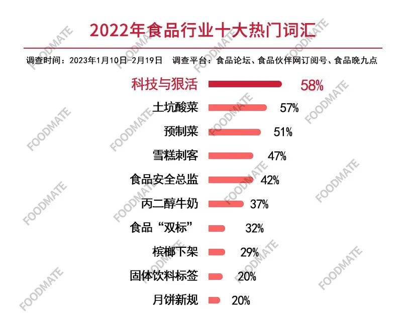 2023年2月19日,由食品伙伴网发起的“2022年食品行业十大热门词汇”评选活动结束。按照以往的惯例,本次活动首先由食品论坛的热心网友针对2022年热门事件概括成一个关键词提交,后经过整理筛选出17个候选词汇,并于2023年1月10日-2月19日在食品论坛投票。今年的投票,我们增加了“食品论坛”“食品伙伴网订阅号”“食品晚九点”三个微信渠道,期间共有1381 位经过审核认证的注册网友参与投票,最终选出“科技与狠活”、“土坑酸菜”、“预制菜”、“食品安全总监”、等十大热门词汇。