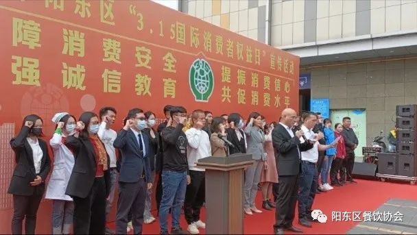 各商家企业代表上台宣誓,阳东区个私企副秘书长张永生和阳东餐饮行业协会秘书长利留运领头宣誓:我愿遵守国家法律法规,格守职业道德规范,严格执行行业标准,以诚实守信为荣,以见利忘义为耻,强诚信意识,树诚信新风,倡诚信理念,做诚信楷模,规服务行为牢记社会责任,维护行业形象,保证服务质量。